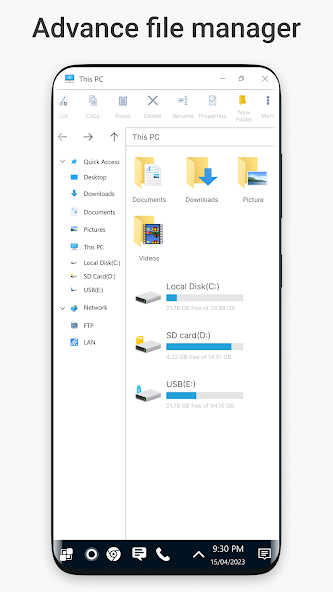 Приложение полностью преображает внешний вид вашего Android: меню «Пуск», панель задач, плитки, иконки и центр уведомлений выполнены в стиле Windows 11. Пользователь получает не просто симуляцию, а продуманный рабочий стол с плавной анимацией и настраиваемыми элементами.