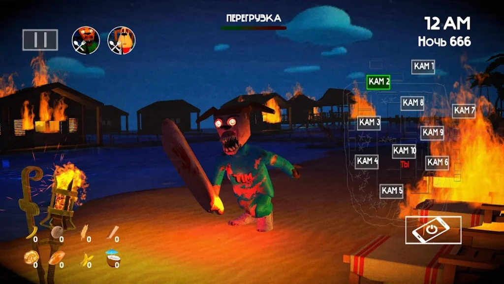 Днем остров манит серфингом, дайвингом и прогулками по джунглям, но с закатом начинается настоящий кошмар: Тимоха и подручные крадутся в темноте, а один неверный тап — и скример в лицо. Атмосфера тропическая, с пальмами и океаном, но пропитана юмором про жирный пирог, который всех пугает.
