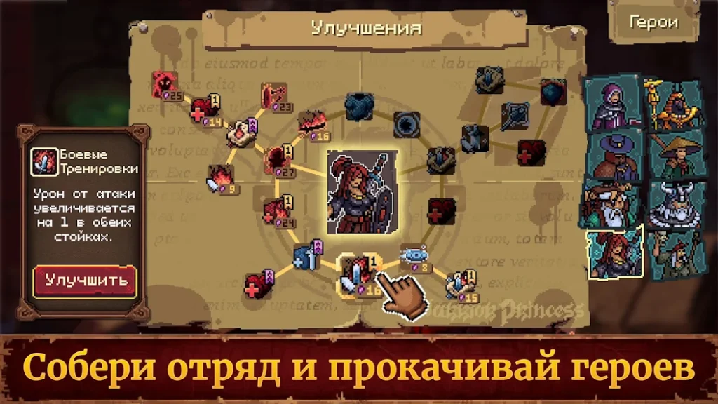 За прохождение миссий падают кристаллы ада для прокачки героев. У каждого персонажа отдельный счетчик кристаллов, апгрейды идут независимо. Между уровнями на демоническую эссенцию покупаются временные усиления: атака, здоровье, способности.