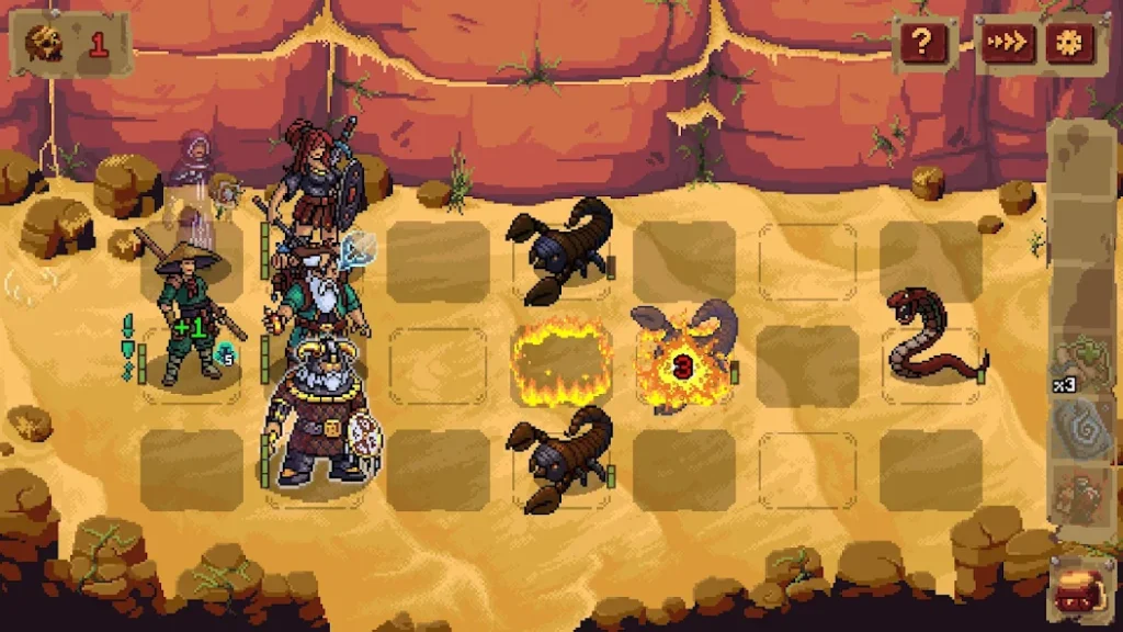 У каждого юнита своя дальность атаки. Воительница в первой стойке бьет только в упор, алхимик метает зелья на расстояние. Существует четыре типа урона: физический, магический, огненный и смерти. У всех бойцов и врагов разные сопротивления к этим типам. Мумия получает дополнительный урон от огня, статуи устойчивы к физике.