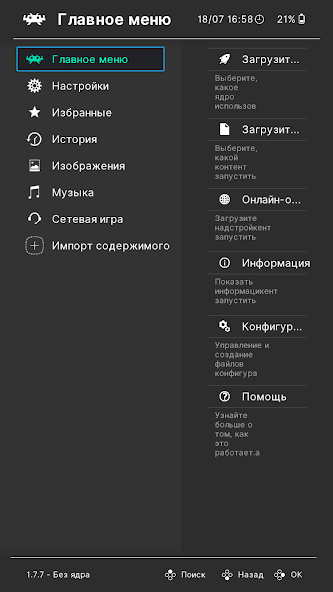 Работа с приложением интуитивна: загружаешь ROM-файл, выбираешь нужное ядро эмуляции и запускаешь игру. RetroArch автоматически определяет тип игры и подбирает подходящий эмулятор, избавляя от лишних настроек. При этом пользователь может вручную выбрать любой из доступных ядер для оптимизации производительности или совместимости.