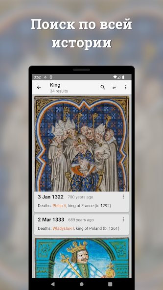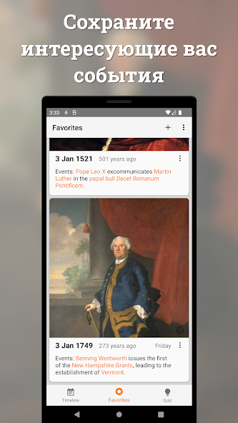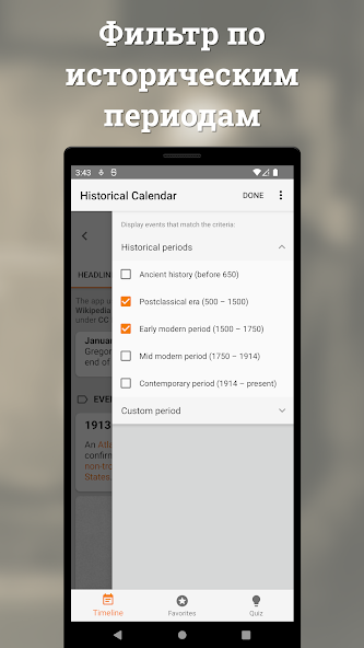 Пользователь может гибко настраивать отображение данных, выбирая только те типы событий, которые ему интересны. Присутствует мощный поиск, позволяющий найти информацию по конкретному году или ключевому слову. Также приложение предлагает режим викторины, превращая процесс обучения в увлекательную игру на проверку памяти.
