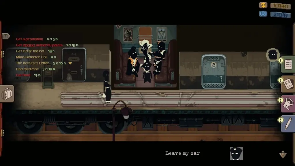Система прогрессии построена на доверии руководства. Чем больше успешных доносов и выполненных заданий на вашем счету, тем выше ваш класс. Путешествие в вагонах для высших чинов открывает новые геймплейные возможности и более сложные квесты. Однако не забывайте: чем выше вы поднимаетесь, тем внимательнее Министерство следит за вами самими.