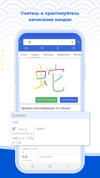 Отдельные разделы посвящены кандзи: чтения он/кун, примеры композиций, порядок штрихов и уровень JLPT. Есть возможность сохранять слова в избранное, создавать списки для повторения и изучать с помощью встроенных упражнений.
