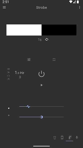 Приложение обладает лаконичным интерфейсом, где центральное место занимают элементы управления частотой мерцания. Пользователи могут мгновенно регулировать скорость вспышек с помощью интуитивного ползунка, достигая эффекта как медленного мигания, так и высокочастотного стробоскопа. Визуальная составляющая программы выполнена в темных тонах, что удобно при использовании в темноте, так как экран не ослепляет владельца.