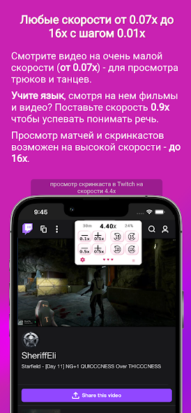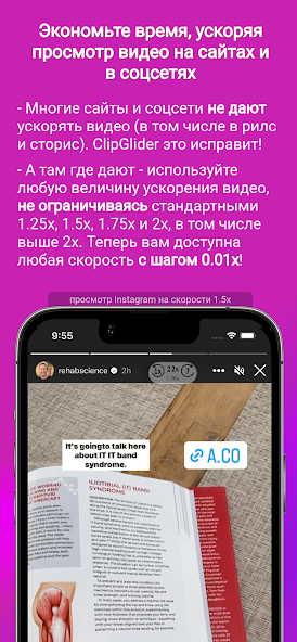 Встроенные видеоплееры соцсетей и браузеров ограничены базовыми функциями. ClipGlider добавляет поверх них плавающую панель с расширенными опциями: точная скорость воспроизведения, переход к конкретной минуте в три нажатия, режим «картинка в картинке» (PiP) и воспроизведение с заблокированным экраном. Теперь можно слушать подкасты и лекции, положив телефон в карман, или смотреть видео в маленьком окошке поверх других приложений.