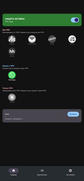 Интерфейс приложения интуитивно понятен: вы видите привычные иконки, которые становятся черно-белыми, когда программа находится в режиме гибернации. Обычный тап по значку инициирует целую цепочку действий: активацию нужного узла связи, проверку готовности сети и последующую «разморозку» целевого приложения. Решение загрузить на смартфон такой комбайн значительно упрощает жизнь тем, кто постоянно работает с разными сетевыми профилями.