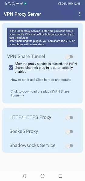 Одной из интересных фишек приложения является возможность работы с плагином VPN Share Tunnel. Это решение для тех случаев, когда стандартное приложение для защиты трафика «захватывает» все ресурсы телефона и не дает прокси-серверу отвечать на запросы других устройств. Путем нехитрых манипуляций в настройках можно создать исключение, которое позволит вашим гаджетам видеть открытый порт и подключаться к нему.
